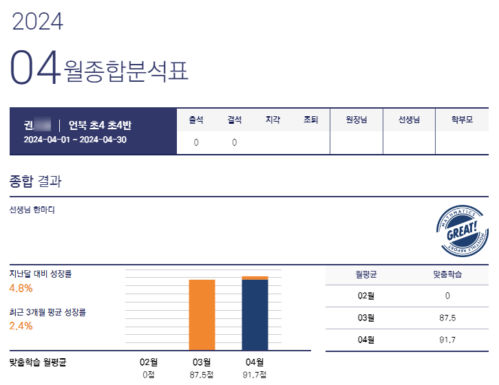 | 10번째 성공 사례 학동초 4학년 김00 학생의 4월 성취도 분석 (0) | 2024.04.28 |